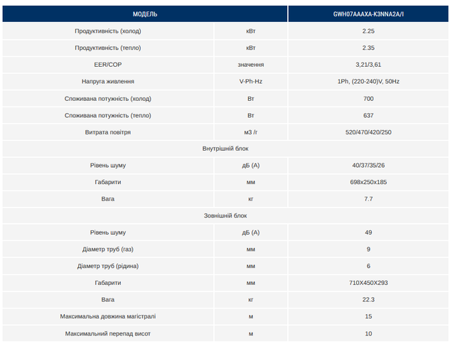 Модель GWH07AAAXA-K3NNA2A - найменший 7 типорозмір кондиціонера з шести представлених в каталозі, відрізняється низьким рівнем шуму - всього 26 дБ. Оновлений дизайн внутрішнього блоку запам'ятається стильною золотистої смугою, за якою ховається інформаційна панель зі світлодіодними цифрами, які тепер будуть помітні лише під час роботи. Енергоефективність спліт-системи класу «А», наявність всіх необхідних функцій для комфорту користувача і оптимальна продуктивність роблять цей кондиціонер найкращим рішенням для будинку і офісу.